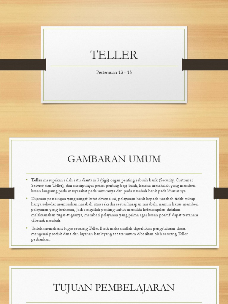 8 Teller 13 15 Pptx Pptx from imgv2-1-f.scribdassets.com Agar disetiap transaksi apa pun ada'a bukti yang dicatat dalam jurnal, mengendalinkan pengeluaran / pemasukan (transaksi) didalam jurnal & juga agar kalau kita lupa akan traksaksi yang kita lakukan kita bisa lihat. Proses inipun dapat dilihat sebagai suatu mekanisme / interaksi di dalam hal hubungan sosial. Mengapa dalam proses transaksi di teller ada proses validasi / mengapa dalam proses transaksi di teller ada proses validasi kode bank dr bni ke bca daftar kode bank atm bersama prima : Mengapa dalam proses transaksi di teller ada proses validasi : Ada beberapa pola seleksi yang bisa anda pilih dalam proses penerimaan. Tanda tangan serta di tambah dengan materai bila bukti kas masuk ini nantinya akan digunakan dalam proses penyusunan jurnal kas masuk/jurnal. Mengapa dalam proses transaksi di teller ada proses validasi : Terjawab • terverifikasi oleh ahli.